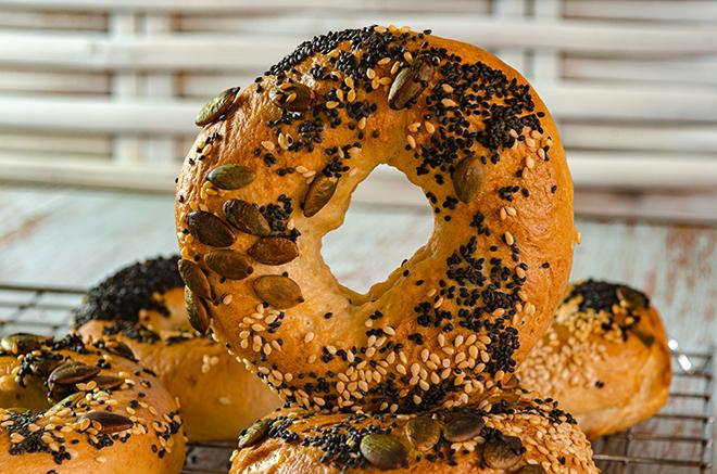 - Bagels auf das Backblech legen und mit Körnern bestreuen.