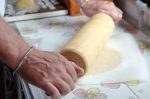 - Den Backofen auf 200° Ober-/ Unterhitze vorheizen. 3 Bögen Backpapier (ca. 30x30 cm) zurechtschneiden. Den Teig in 2 Hälften schneiden und zwischen 2 Blättern Backpapier auf ca. 20 cm Ø ausrollen.